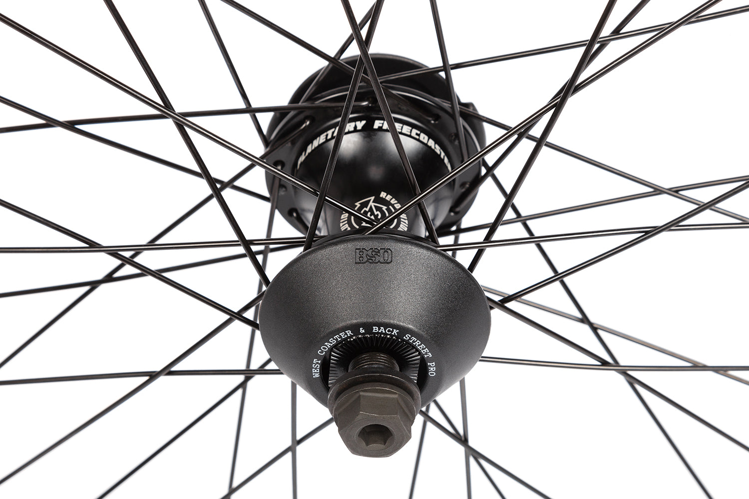 BSD's latest complete rear freecoaster wheel built around the new lightweight BSD Revolution freecoaster hub and BSD XLT rim, using BSD spokes and rimtape.